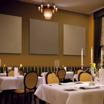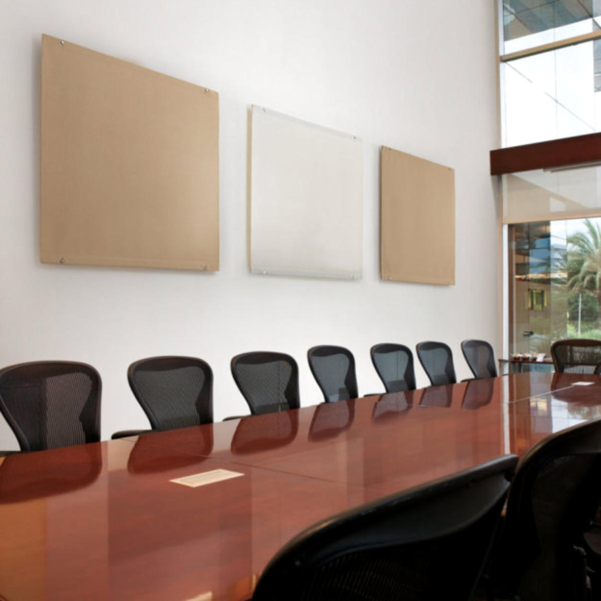 Design Sezgin AksuAkustikelement für die Befestigung an der Wand über vier verchromten Stahladaptern mit federnd gelagerten Aufnahmen. Das Akustikflies wird durch zwei Metallschienen gespannt und mit dem Wandhaltern verbunden. Zur Anpassung des Leistung sind die Abstände zur Wand in vier Stufen Einstellbar. Eine Erhöhung der Leistung ist durch das hintereinander Anordnen von zwei Stoffbahnen möglich. Maße: 120 x 120 / 240 cm in den Farben Weiß, Silbergrau, Beige, Taupe und Rot.