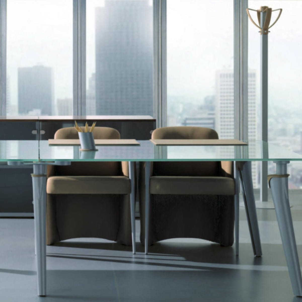 •Funktionelles Chefzimmerprogramm mit italienischen Flair im Stil der 60-iger Jahre•Ergonomische Arbeitsplätze mit praktischen Konfigurationen und Formen•Klassische Varianten für Ablage in Form von Sideboards und Bücherschränken•furnierte Tischplatten angeschrägt mit schmaler, abgerundeter Kante,•Glastischplatte satiniert oder zum Teil auch in der Farbe Mokka•Kirschbaum-Furnier oder Eiche Furnier in Wenge-gebeizt•Dickleder Natur oder Pflaumenrot mit Sattelstichtechnik•Konische Füße aus geformten Stahlblech silbergrau matt beschichtet•Korpusse in silbergrau oder schwarz matt beschichtet•Accessoires aus Stahl silbergrau beschichtet mit Dicklederummantelung•Zur Komplettierung Bücherschränke, Konferenztische, Kredenz, Büroaccessoires, Sofa, Stühle